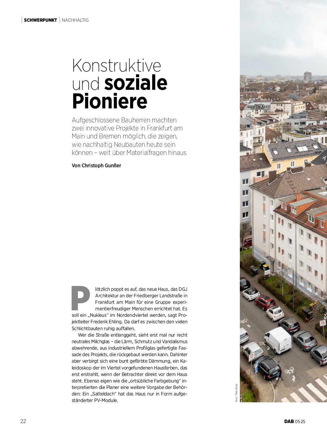 Auszug: „Plötzlich poppt es auf, das neue Haus, das DGJ Architektur an der Friedberger Landstraße in Frankfurt am Main für eine Gruppe experimentierfreudiger Menschen errichtet hat. Es soll ein „Nukleus“ im Nordendviertel werden, sagt Projektleiter Frederik Ehling. Da darf es zwischen den vielen Schlichtbauten ruhig auffallen.“