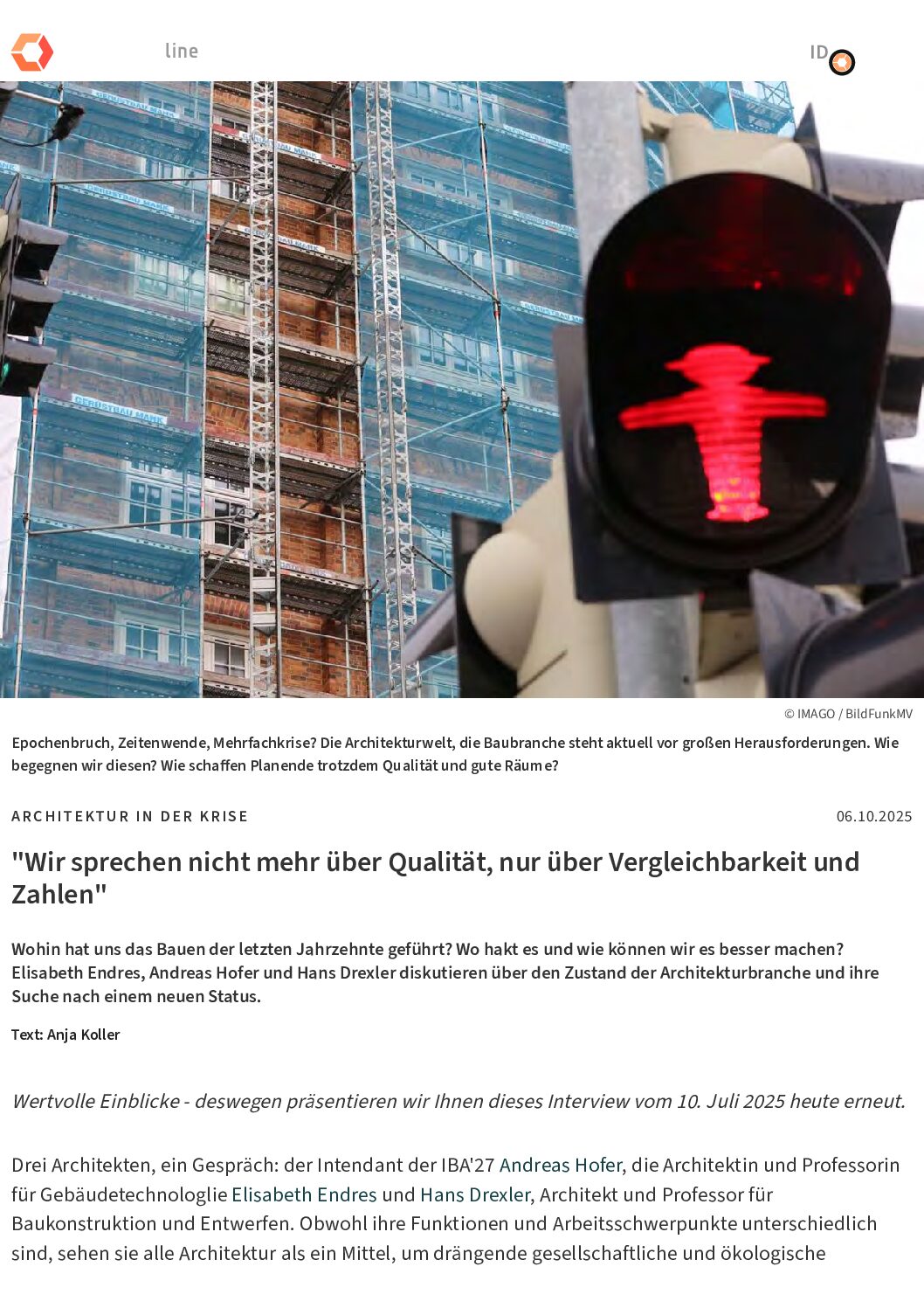 Auszug: „Architektur in der Krise – Wohin hat uns das Bauen der letzten Jahrzehnte geführt? Wo hakt es und wie können wir es besser machen? Elisabeth Endres, Andreas Hofer und Hans Drexler diskutieren über den Zustand der Architekturbranche und ihre Suche nach einem neuen Status.“