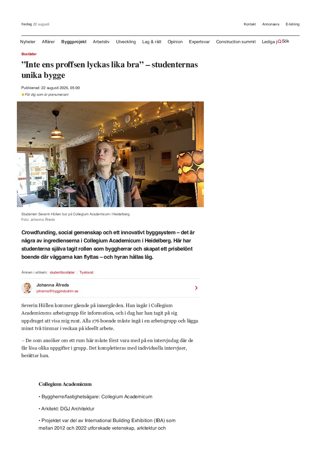 Auszug: „Ende 2024 wurde das Studierendenwohnheim Collegium Academicum (CA) in Heidelberg mit dem Deutschen Nachhaltigkeitspreis für Architektur 2024 ausgezeichnet, ein Höhepunkt in einer inzwischen erfreulich langen Reihe von Anerkennungen, die die Einzigartigkeit dieses Projekts würdigen. Das Collegium Academicum definiert die Beziehung zwischen Menschen, Architektur und Nachhaltigkeit neu und zeigt, dass hochwertige Lebensräume bezahlbar, klimaschonend, ressourceneffizient und sozial integrativ sein können.“