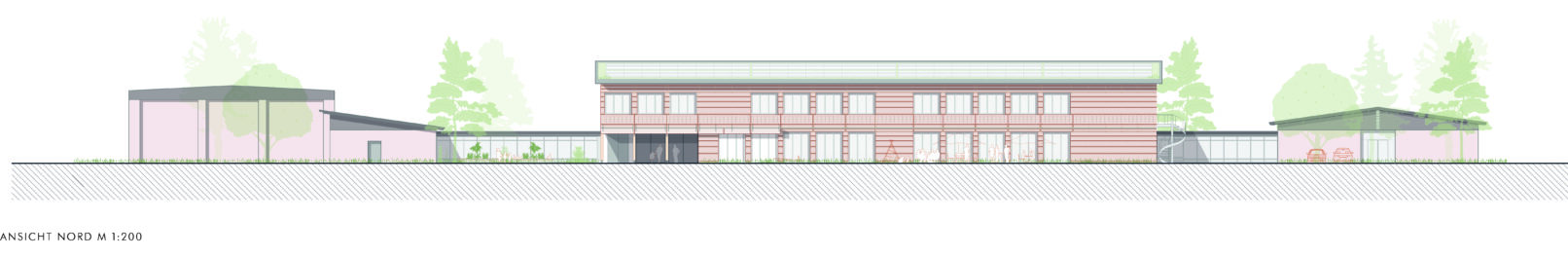 The Klaus Groth School was built in the 1960s and extensively renovated in the mid-2000s. However, the space available no longer meets today’s requirements. The current buildings of the Klaus Groth School have a clear structure thanks to the central axis, which connects all parts of the building and helps the children find their way around. They are well suited for use and can be adapted to the new space requirements of a cluster school with minimal intervention in the internal structure. What the school lacks is a central space: the heart of the school, which DGJ Architektur has placed in its design with a simple new building in a central location. Building on the existing potential, DGJ and its partners at lichtelandschaften have combined the additional space required (canteen and another cluster) in a compact new building with a green schoolyard and positioned it along the access axis. This central new building offers two advantages: