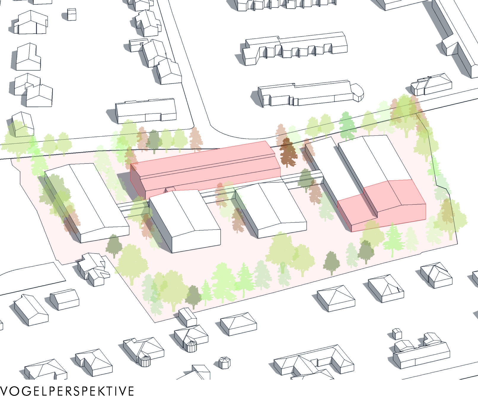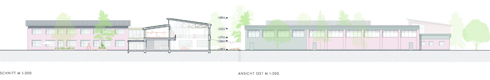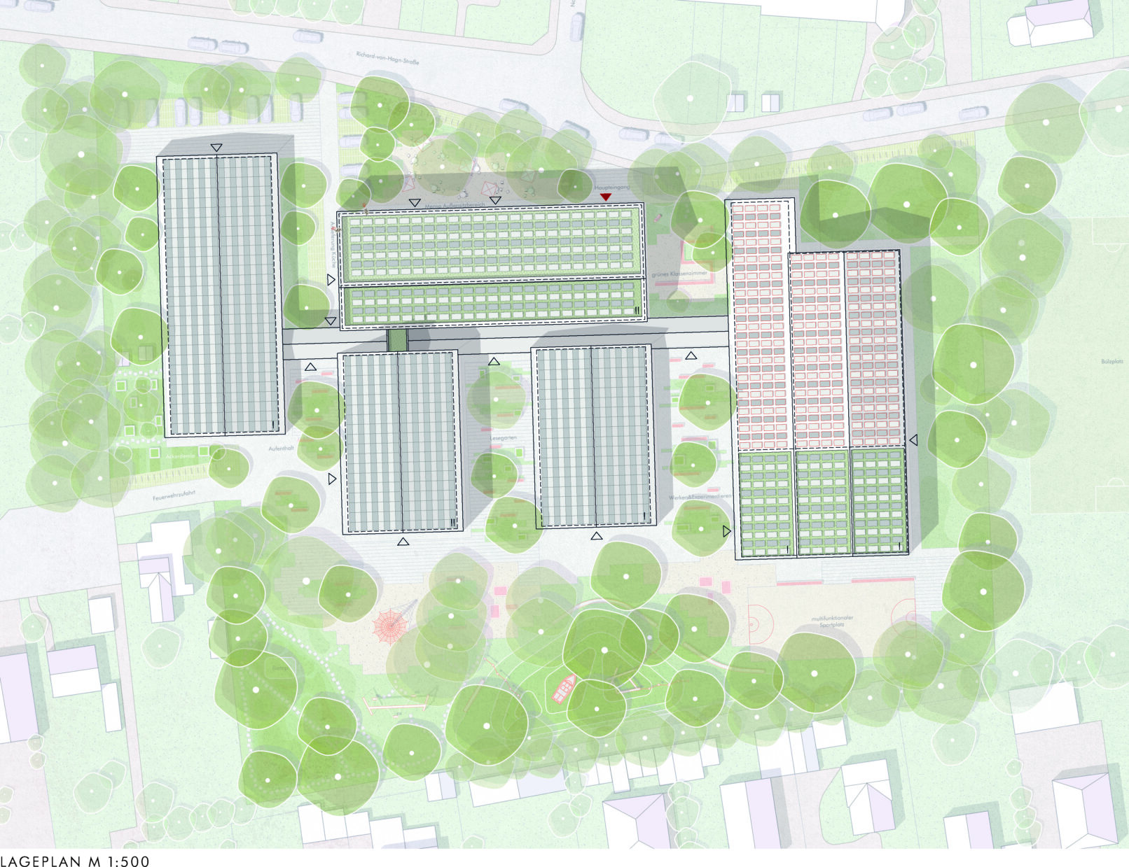 A schoolyard is being created in the outdoor area that will meet the diverse requirements of a place for learning and recreation. The existing situation will not be completely renovated. Instead, a forward-looking location will be developed from the existing structure. In the area of the main entrance in the north, a new address will be created facing the public street. The existing trees will be integrated into the design. High-quality recreational areas for the canteen and an outdoor classroom will be created. The sealed surfaces throughout the schoolyard will be unsealed and connected by a new, coherent design language. The ‘green pixels’ will be planted with different vegetation to create individual atmospheres. Recreation areas will be created to the south between the buildings: based on the ground floor uses, a workshop and experimentation area, a reading garden and quiet areas will be created. The unsealed areas will be planted according to theme. Multi-stemmed trees will create shaded recreation areas. Rainwater will be collected on site and allowed to seep away.
