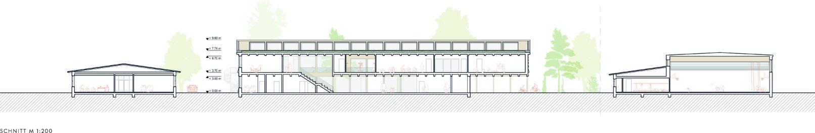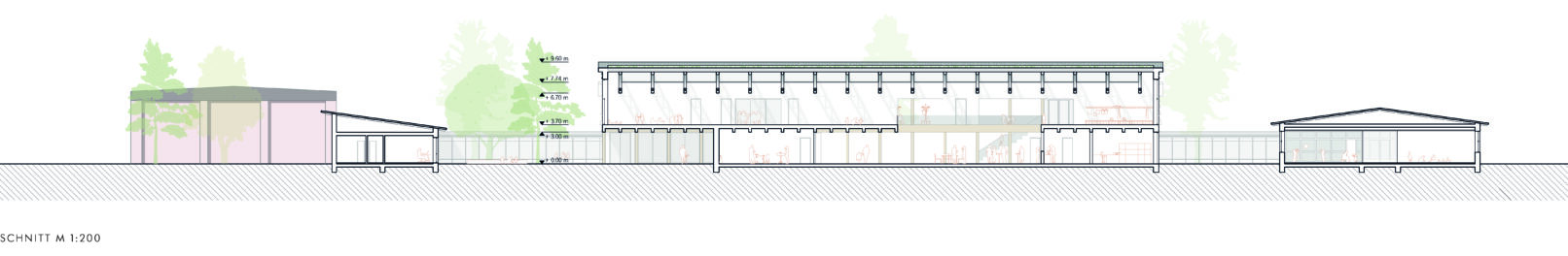 The extension will be constructed using timber, which is the optimal solution in terms of resource consumption and climate relevance. The structure is designed as a simple skeleton construction with supports, glued laminated timber beams and simple truss beams for the large spans. Walls and ceilings will be prefabricated by inscribing the components of the skeleton into the timber frame walls. The partitions will be designed using timber frame elements that already contain insulation. Surfaces, façades, building services and bathrooms will also be prefabricated in the factory, enabling fast, sustainable and high-quality construction. The timber construction can be manufactured and assembled by any large carpentry company, meaning that the added value of the construction project remains in the region.