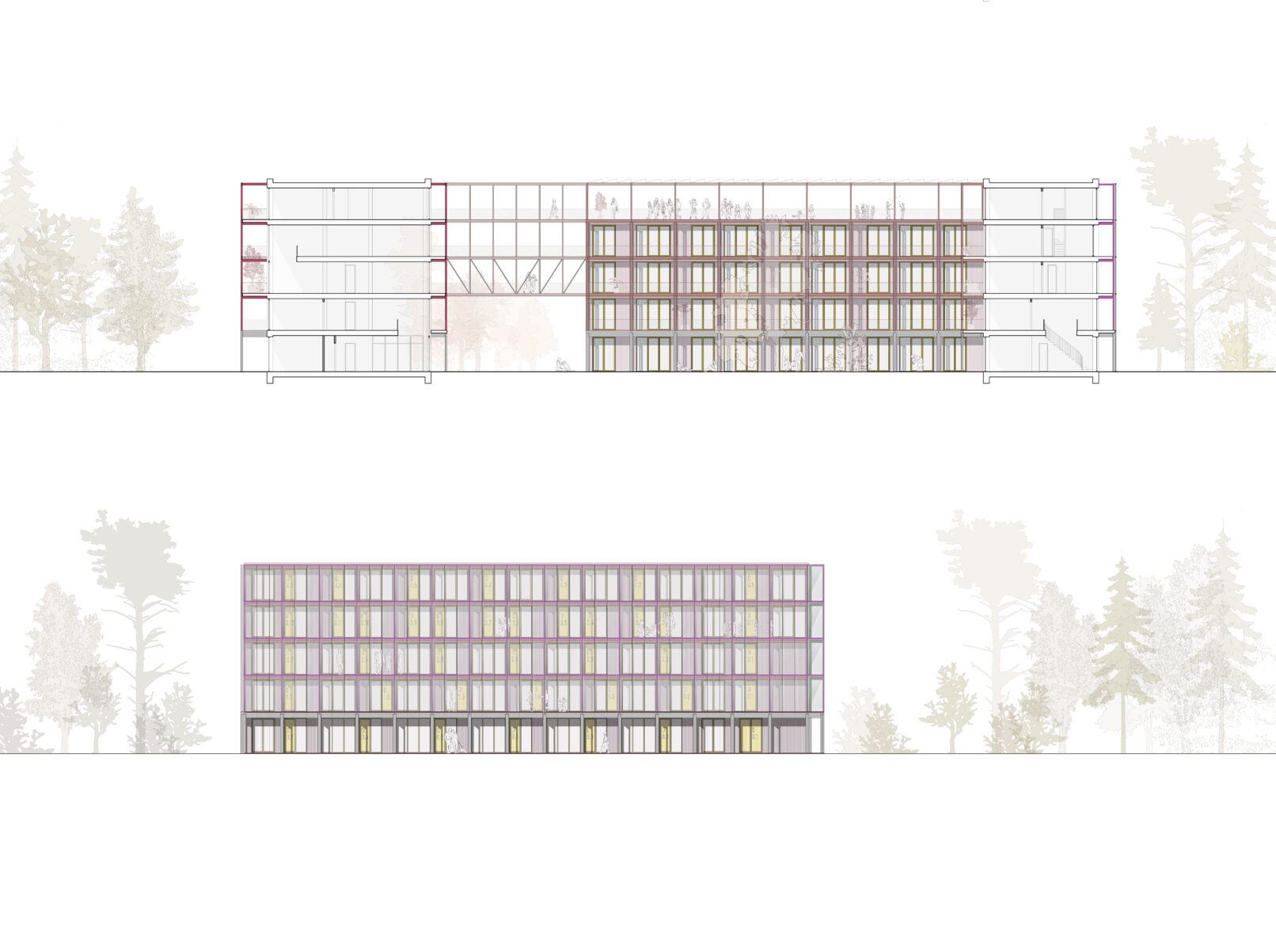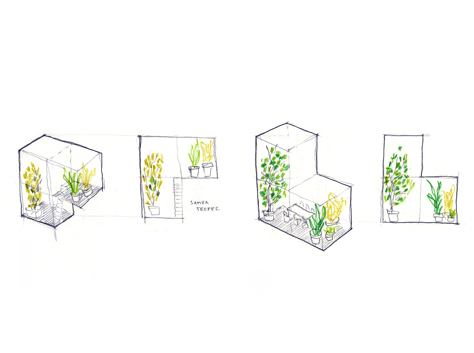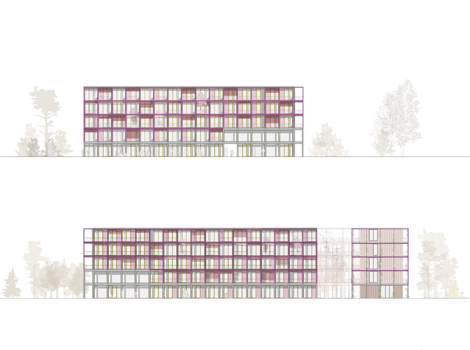 Our design responds to these requirements by designing a building for construction site 2 with living spaces that are as neutral as possible and open to different uses. The design includes integrated commercial spaces as well as communal areas and thus makes offers to the entire neighbourhood of the “Kastel Housing Area” with urban spaces that are designed to be more sustainable, greener and more liveable. The south-western front of the new building in particular, with its prominent location opposite the new Bertha-von-Suttner primary school and the new day care centre with its extensive green spaces, offers a great deal of potential for a thriving network of the neighbourhood and its residents, in which motifs from the neighbouring gardens are taken up and continued and the communal uses of the new building further promote social interaction. At the same time, the integrated green spaces in the building offer residents a variety of options for independent design and retreats for private “recreation in their own green space”.