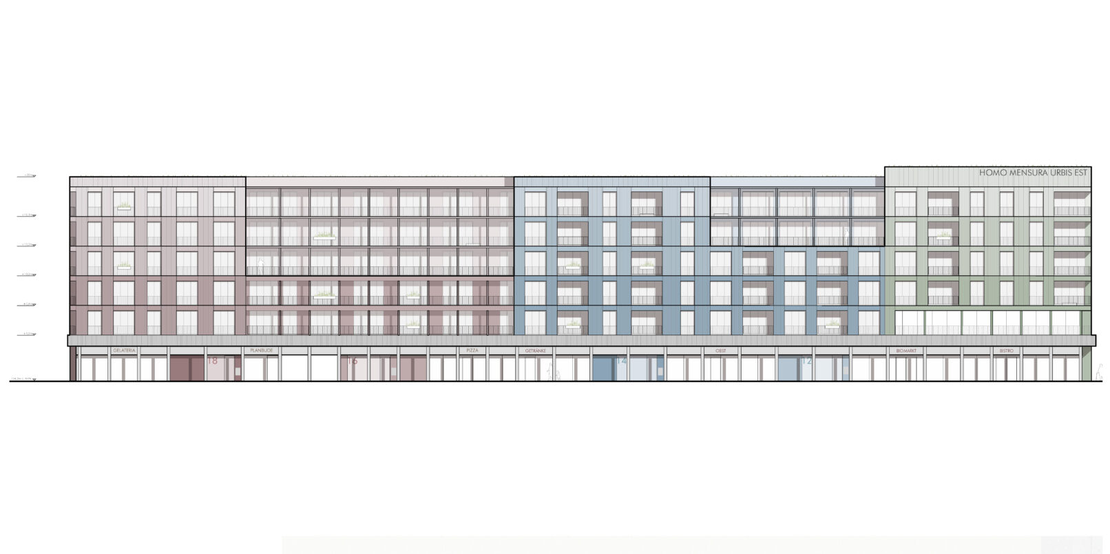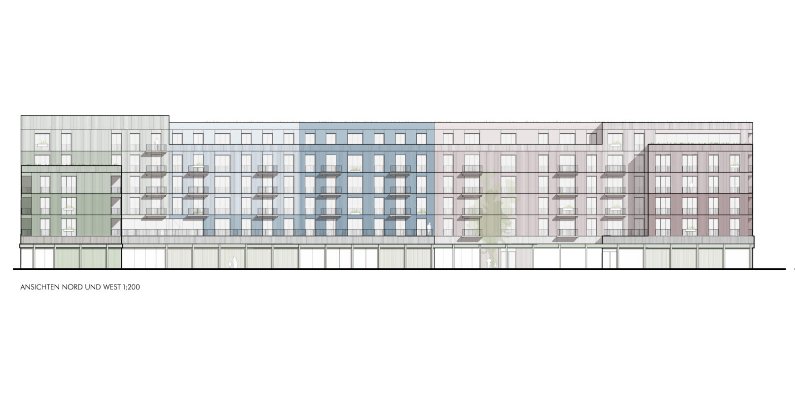 In order to meet the human need for orientation and connectedness in the urban space, the building was divided into four houses, which differ in terms of façade design, depth development, color scheme and apartment floor plans, without losing their design cohesion. The standards of the individual houses are based on the common standards for residential buildings in Karlsruhe. The inviting and friendly color scheme and the differentiated design of the façades with integrated balconies and Spanish loggias offer residents not only usable outdoor areas, but also spaces for individual design and appropriation.