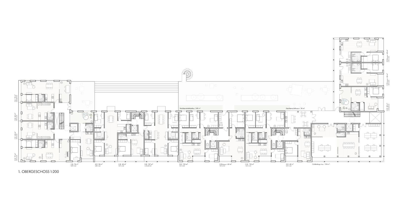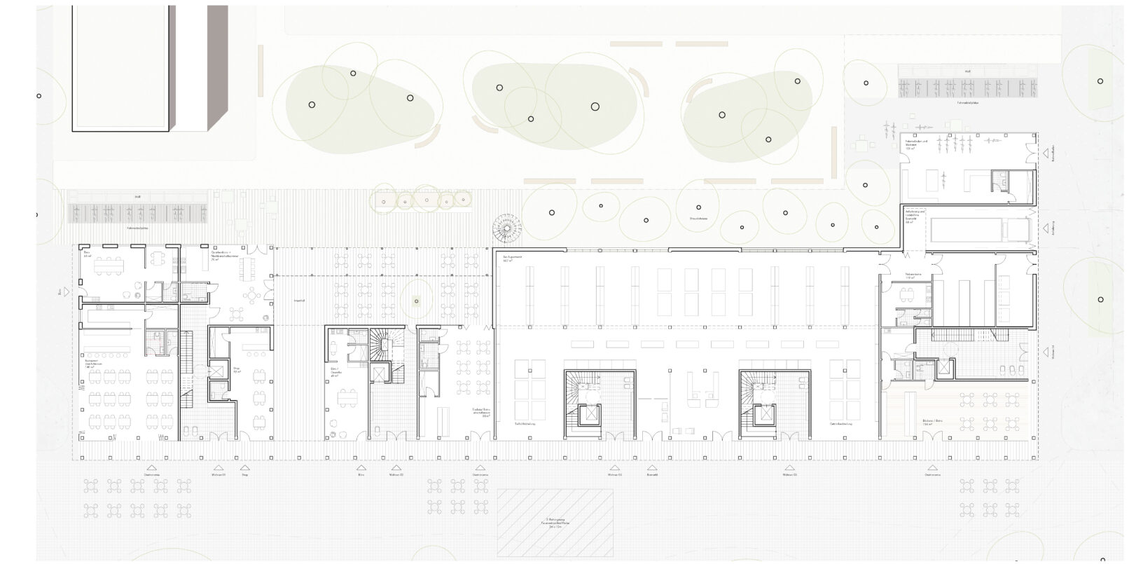 The articulation of the structure and the façades creates an ascending movement from west to east, from natural space to urban space, from flatter buildings to the neighboring high point. The length of the building is structured and creates a visual rhythm for the urban space. The building itself is differentiated by the staggered depths.