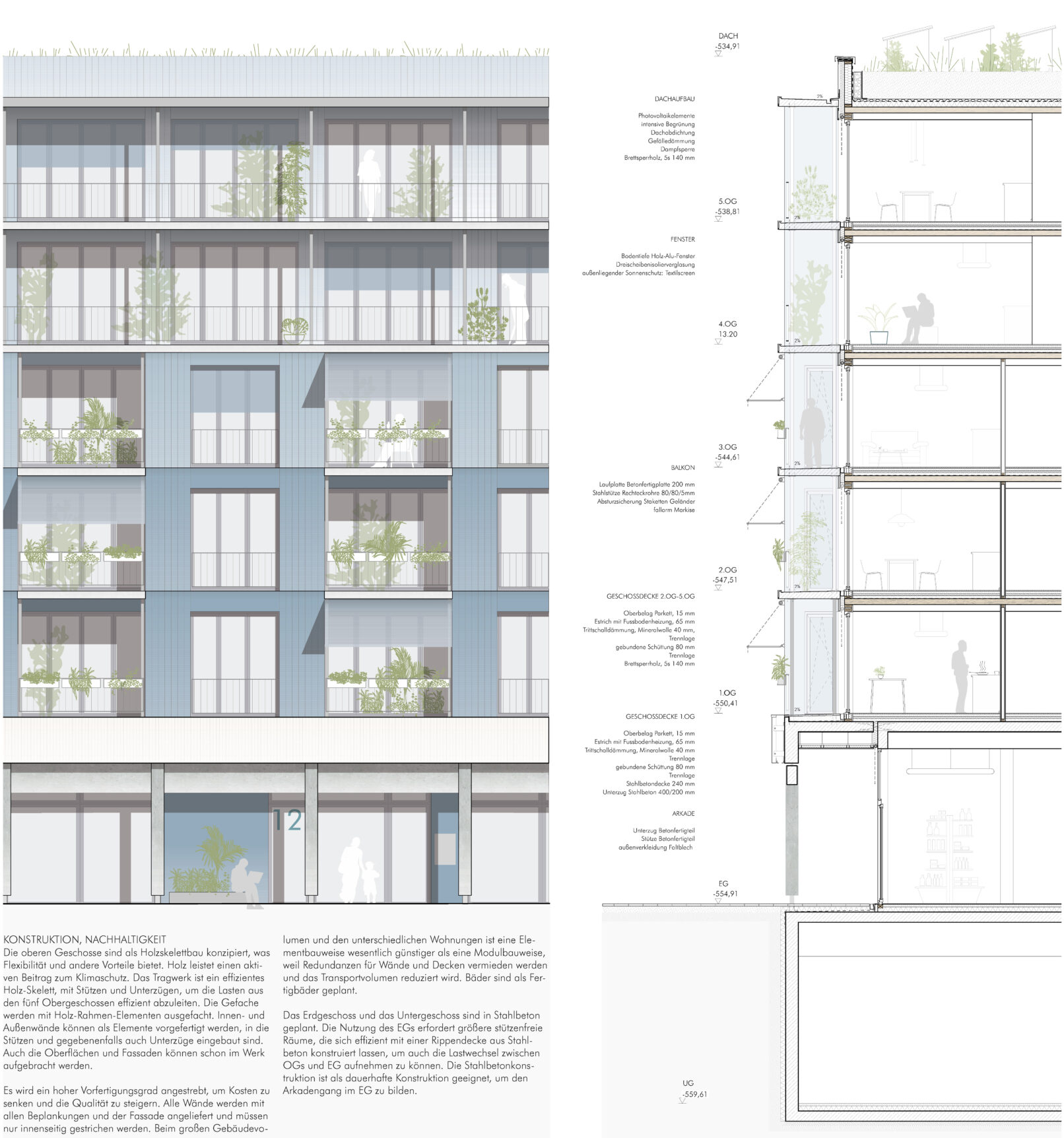 The former American settlement on the old airfield in Karlsruhe’s Nordstadt district offers great potential for a sustainable, future-oriented neighborhood with the nearby nature reserve. The building complex designed by DGJ Architektur on construction site 12 is a central building block whose architectural approach will shape the further development of the new quarter. This aspiration is inscribed in the building through its urban setting and dimensions. The arcade on the ground floor forms a spatial framework for the neighborhood square and establishes a continuous, urban connection to the other residents of the square. For this reason, the arcade in building plot 12 is articulated as a continuous element and forms the urban plinth that supports and connects the buildings above it.