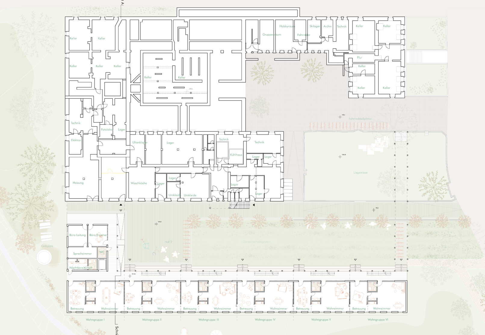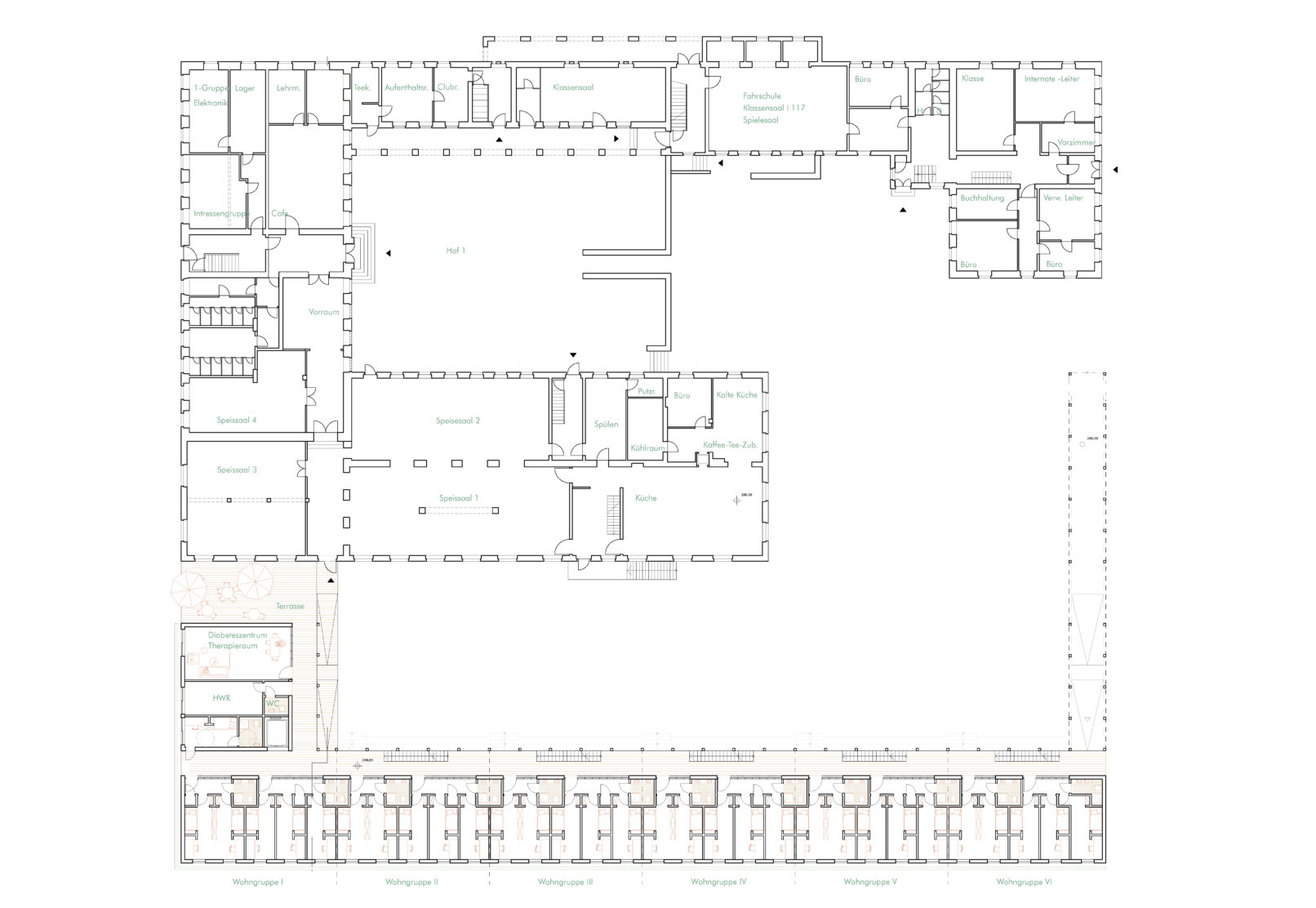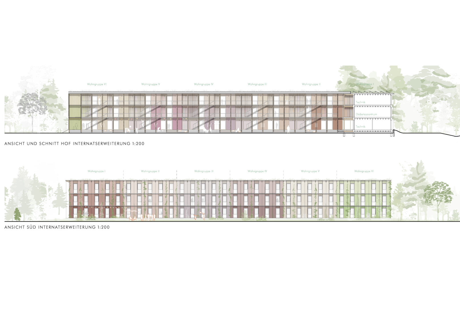 The advantage of the extension is that it functionally complements and upgrades the old building. The new building provides barrier-free access to all levels of the old building. Additional areas of the room program are arranged in such a way that they can also be easily used by existing users. The extension reduces the required building volume. The areas in the old building can still be used for two residential groups, which is a great advantage given the tight budget. The new building also benefits from the spatial connection to the existing building. The boarding students’ rooms have a direct and weather-protected connection to the old building, which houses the canteen and other common rooms. In terms of sustainability and the identity-creating potential of the site, it is also important to continue to occupy the listed building, the heart of the boarding school. The result is an impressive overall structure of old and new that promotes coexistence in the boarding school and strengthens the community spirit.