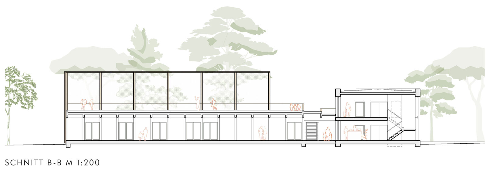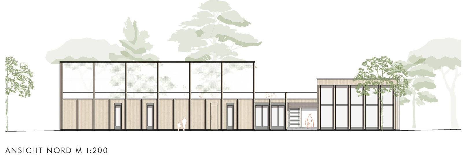 The volume of the new building can be minimized by retaining the existing building. Only the rooms and functions that cannot be accommodated in the small-scale building structure, such as the café and seminar rooms with associated infrastructure, will be added. The façade of the building will be upgraded with a timber façade based on the materiality of the new extension. In this way, the old and the new merge visually and form an ensemble. The new windows and doors will be installed in the timber façade, which will minimize the conversion time. The building technology, especially heating pipes and electrical engineering, can also be integrated into this second shell. As a result, interventions in the existing building are limited. The large trees on the site will also be preserved. The positioning of the buildings was developed in such a way that only minimal changes to the existing trees are necessary. A few small trees will be felled and replaced by new plantings.