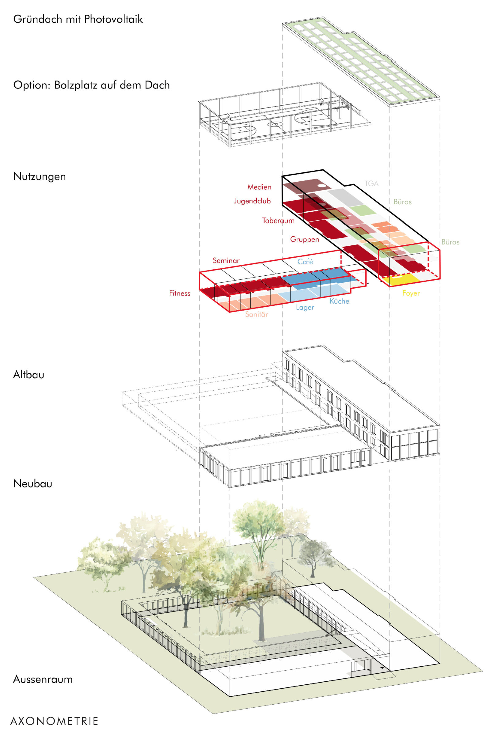 On the roof of the new single-storey building, space is created for further, differentiated uses of the generation center: The roof terrace can be used for events, concerts, sports, games or as a green ‘open-air seminar room’. It has barrier-free access via the foyer.