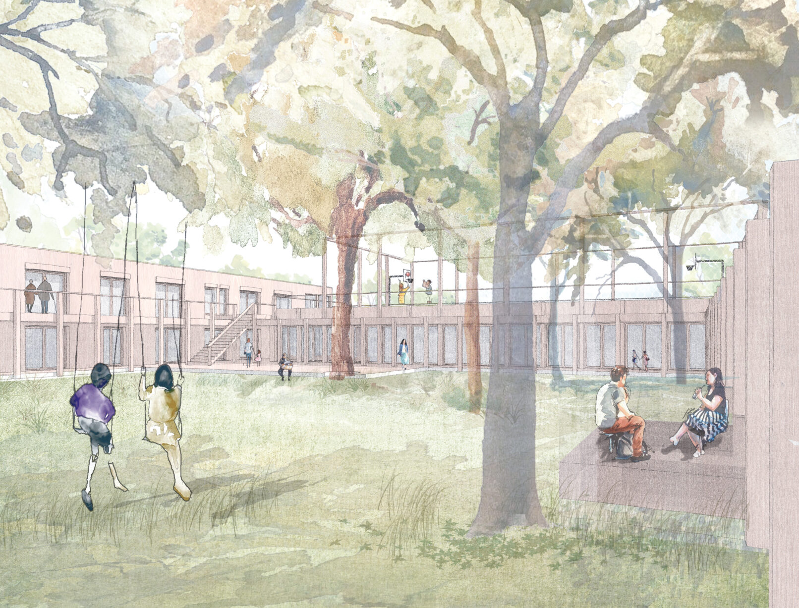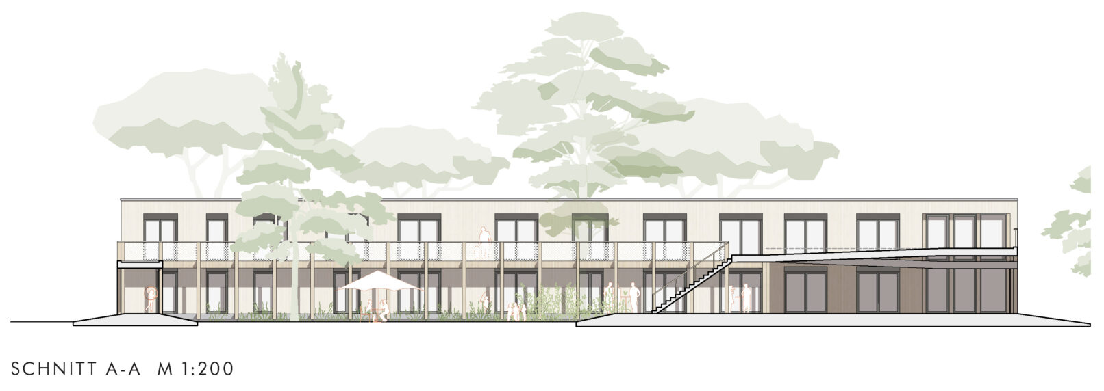 The large trees form a canopy and give the courtyard the atmosphere of an enclosed garden. They provide shade in summer and thus increase comfort in times of increasingly hot summers. The arcade and pergola connects the old and new buildings. An additional access zone is created on the outside of the existing building, which significantly increases the utility value and flexibility of the building. A playground for older children with swings and a climbing frame is planned outside the arcade. Beds can be created in parts of the garden where children can grow their own vegetables. The open green areas outside the arcade are ideal for playing and sports or can accommodate raised beds that can be jointly cultivated by the users.