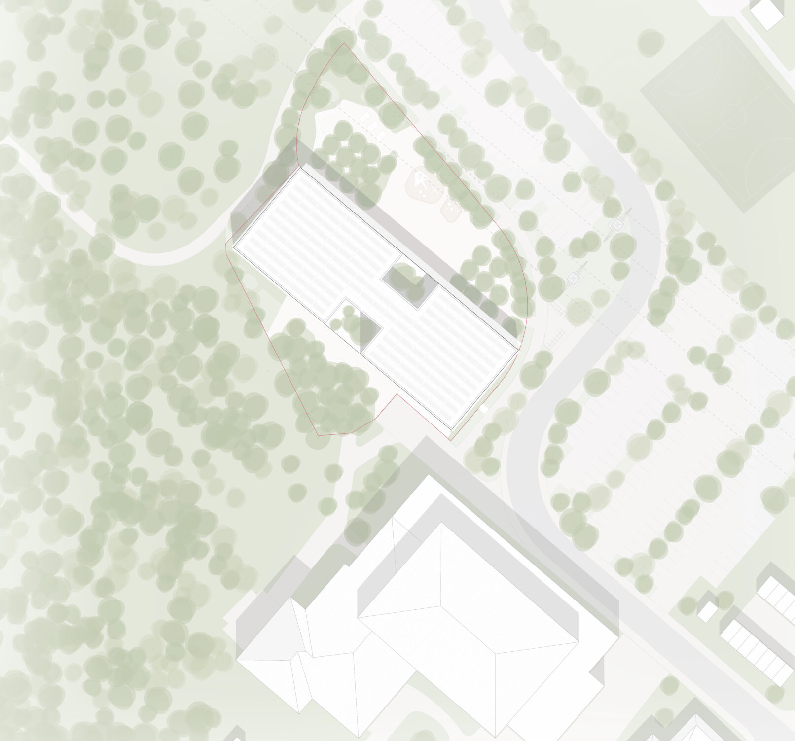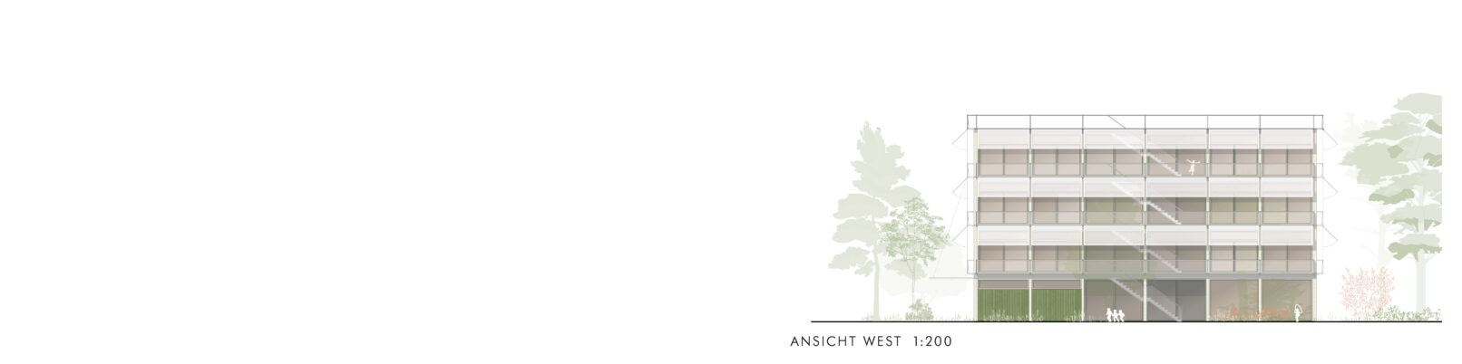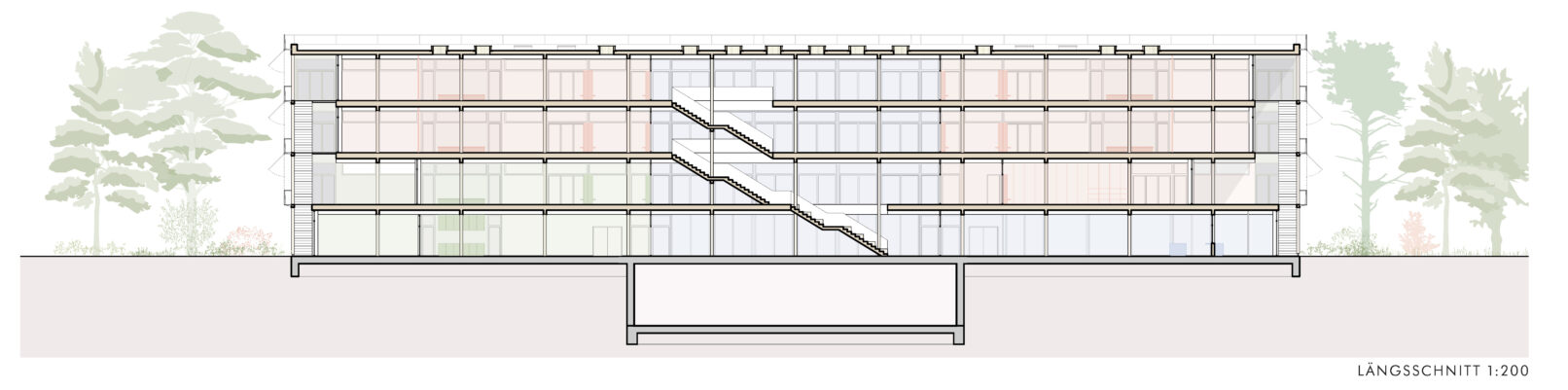 The new primary school building in Stockstadt offers the opportunity to redevelop the typology of a contemporary school. The relatively small building window results in a compact, four-storey structure in which the different areas of use are staggered and connected, especially vertically. This creates a three-dimensional learning landscape for the children in which they can move around during their school day.