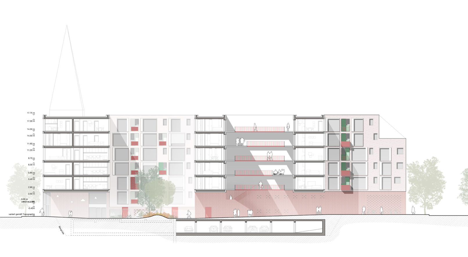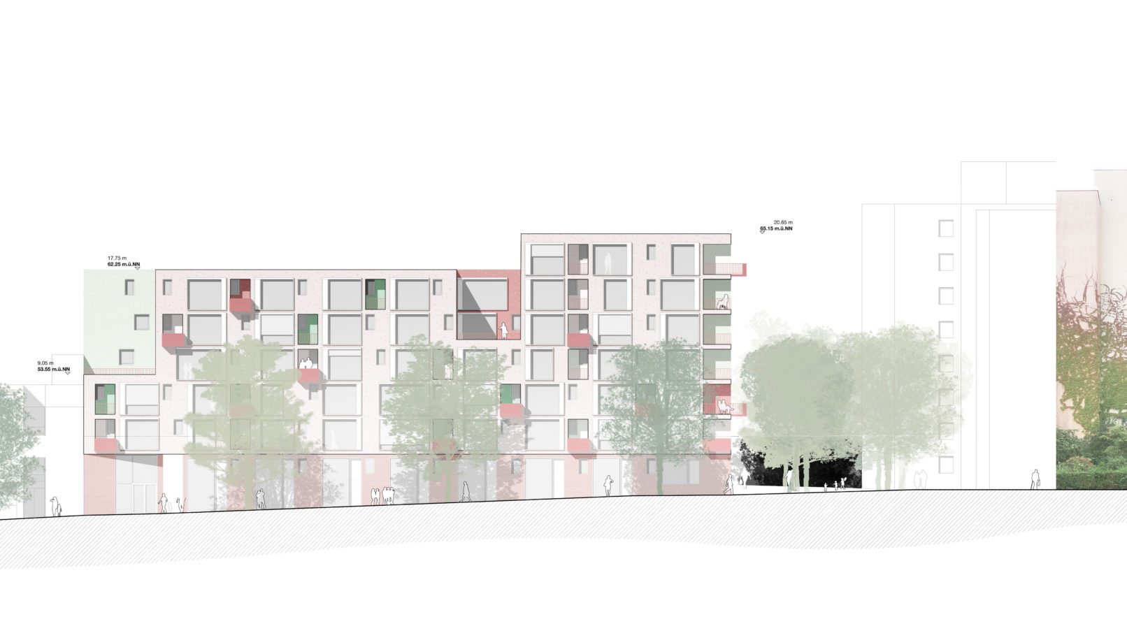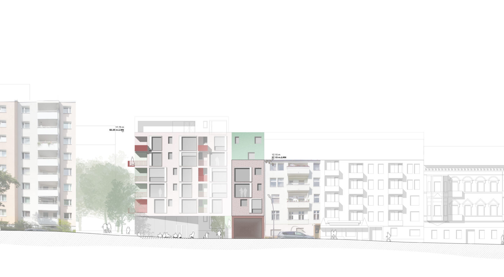 The competition entry for Neukölln forms a link between the block structures of the 19th century in the east and the open urban high-rise buildings of the 80‘s. In this way the building volume closes on one side to the block edges and forms a conclusion of the block. The dense urban constructions typical for Berlin reveals its quality above all from the inner courtyards.