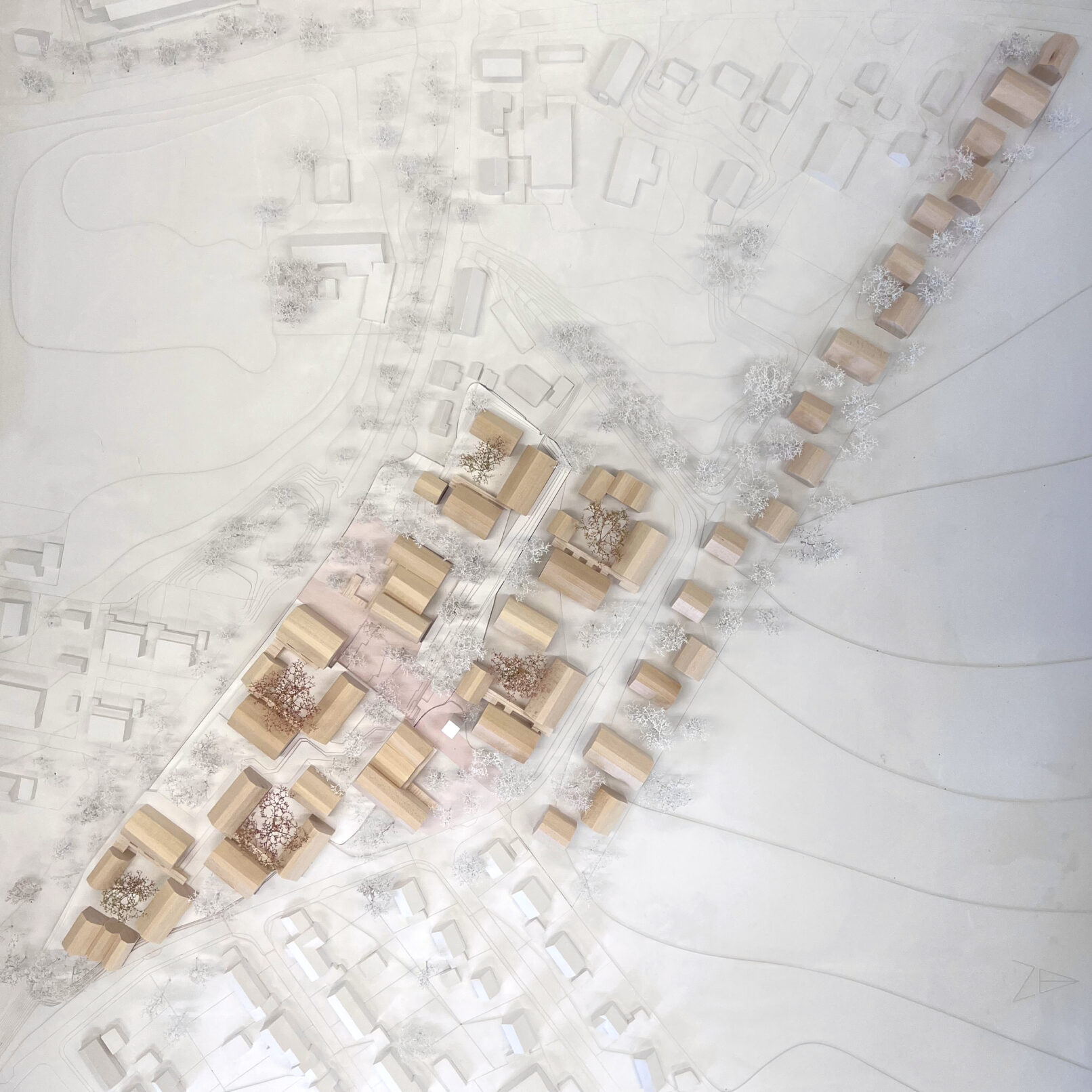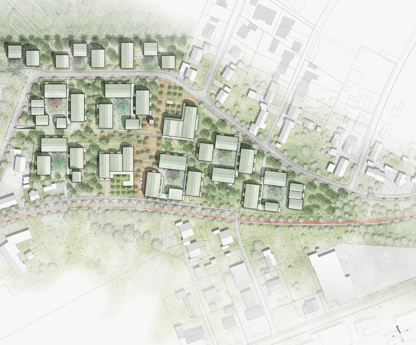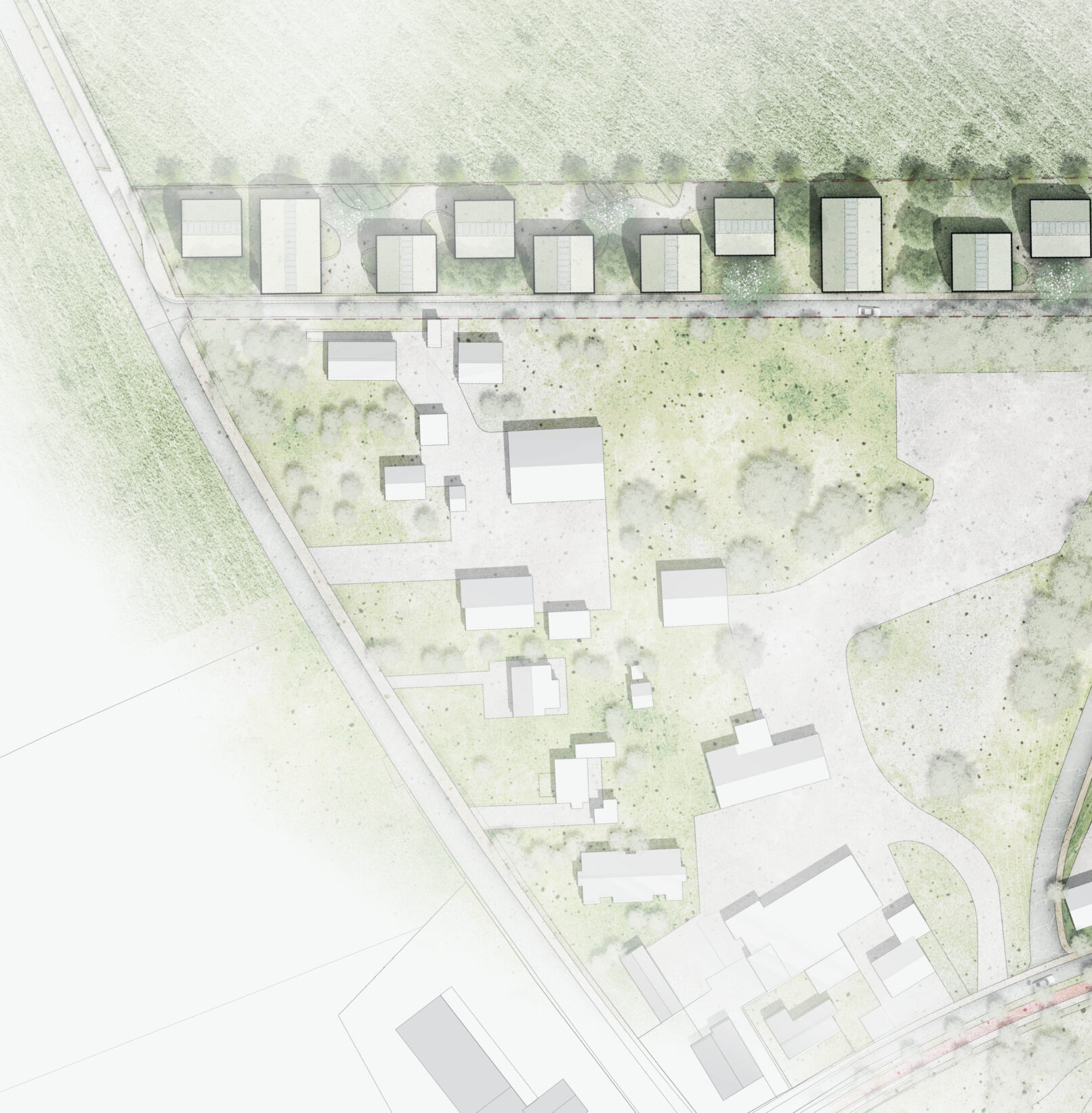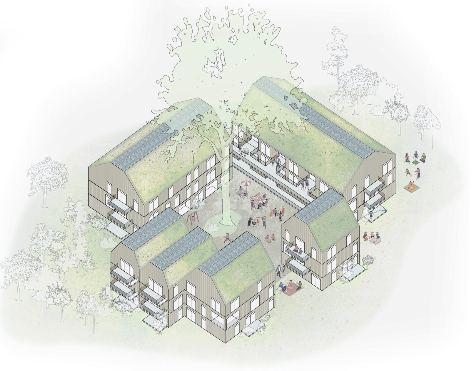 Diese Grundeinheit mehrerer Gebäudegruppen ist jeweils von einem eigenen Landschaftsraum umgeben. Die Gebäude sind kleine Mehrfamilienhäuser, die teilweise über einen seitlichen Laubengang direkt erschlossen werden. Der Wohnhof ist weitgehend als offene Funktionsfläche geplant, auf der ein großer Baum, wie eine traditionelle Dorflinde, Schatten und Schutz spendet. Im Hof kann gespielt, gegessen und gewerkelt werden. Die erdgeschossigen Wohnräume sind zum einen durch einen schmalen Grünstreifen direkt an den Gebäuden vor Einblicken geschützt, zum anderen sind Holzlamellen zum Hof hin geplant, während ein freier Ausblick zum zurückversetzten Eingangsbereich einen Blickbezug nach außen bietet.