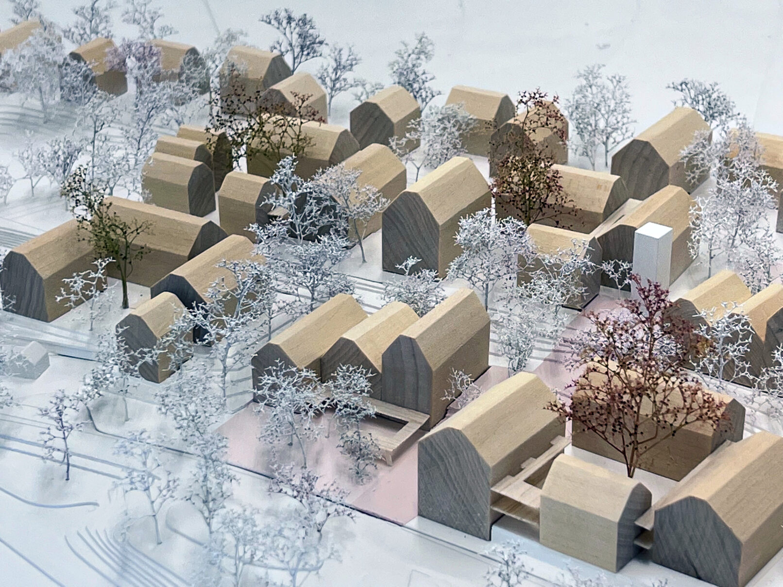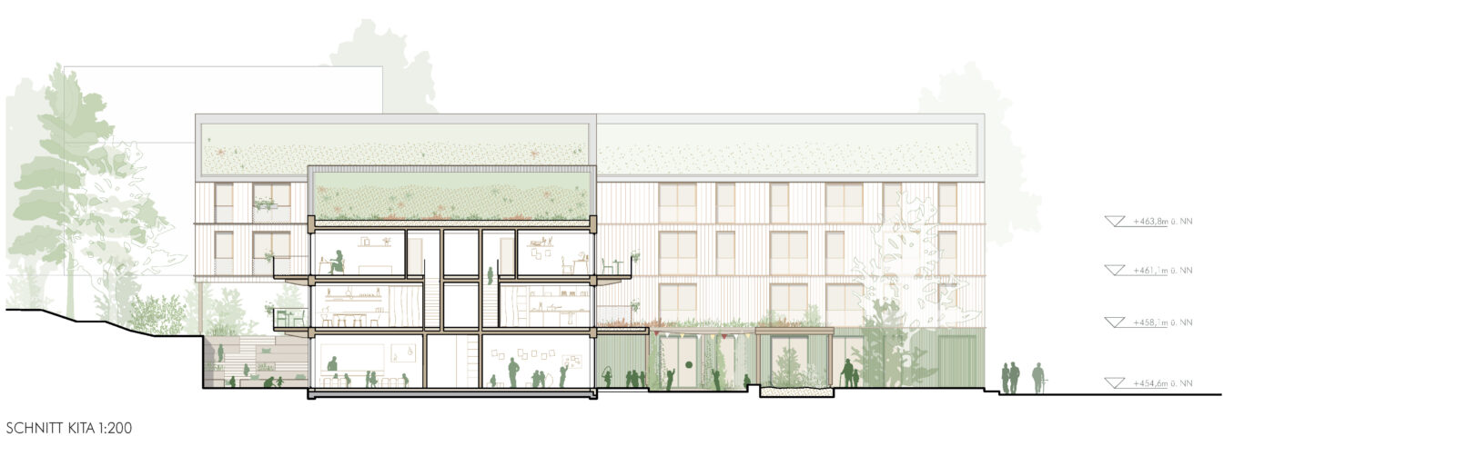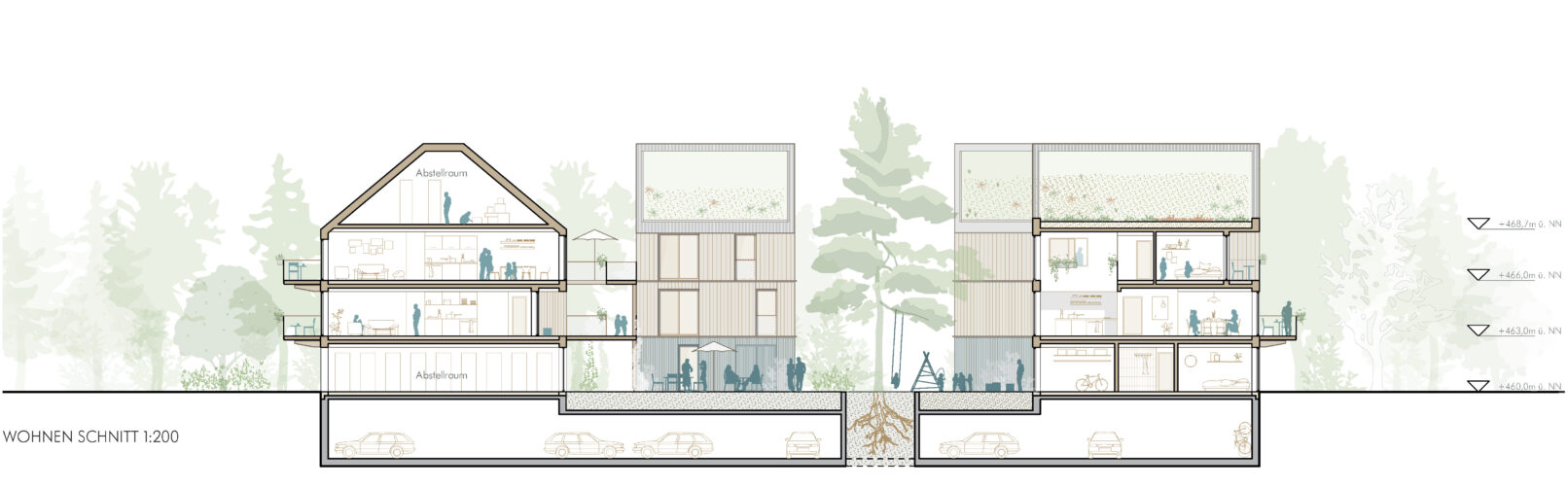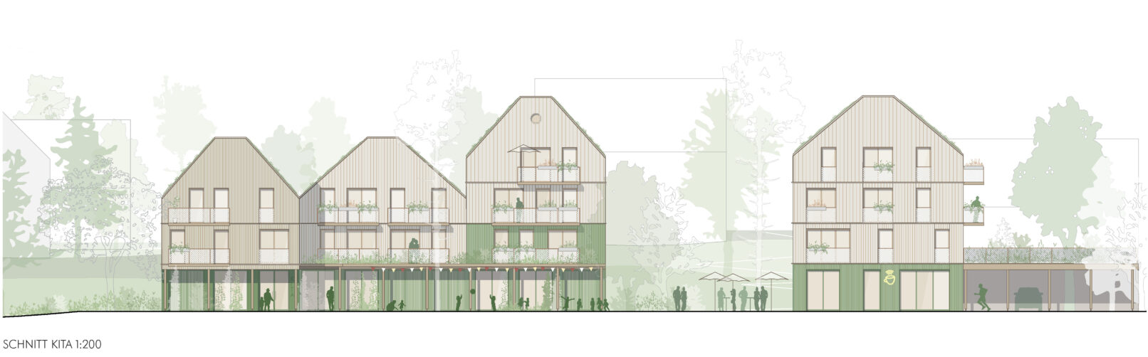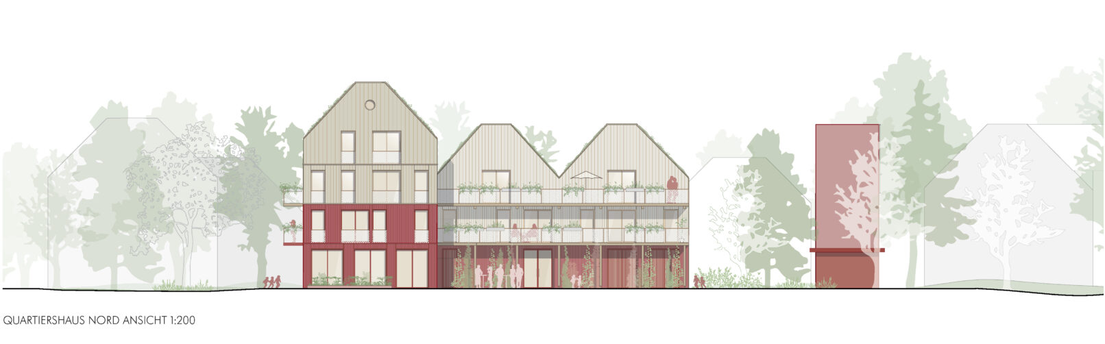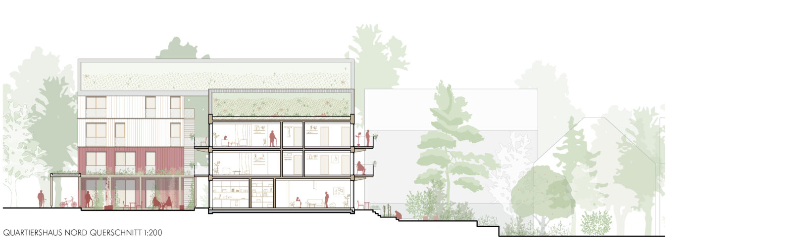 Die beiden Quartiershäuser mit dem Kindergarten und der Tagespflege bilden, zusammen mit den öffentlichen Außenräumen, das Herz des neuen Quartiers. Auch das Café und die Co-Working-Spaces sind entlang eines öffentlichen Raumes angeordnet, der die beiden Höhenlagen des Grundstücks verbindet. Die Gemeinschaftsräume können für Feste oder Veranstaltungen auch von Einzelnen oder Gruppen aus der Nachbarschaft gebucht oder gemietet werden. Durch diese Ausweichmöglichkeiten, wie Gemeinschaftsräume und Co-Working, können bestimmte Wohnfunktionen aus den individuellen Wohnungen ausgelagert werden. So können die Wohnungen und Häuser selbst kompakter sein.