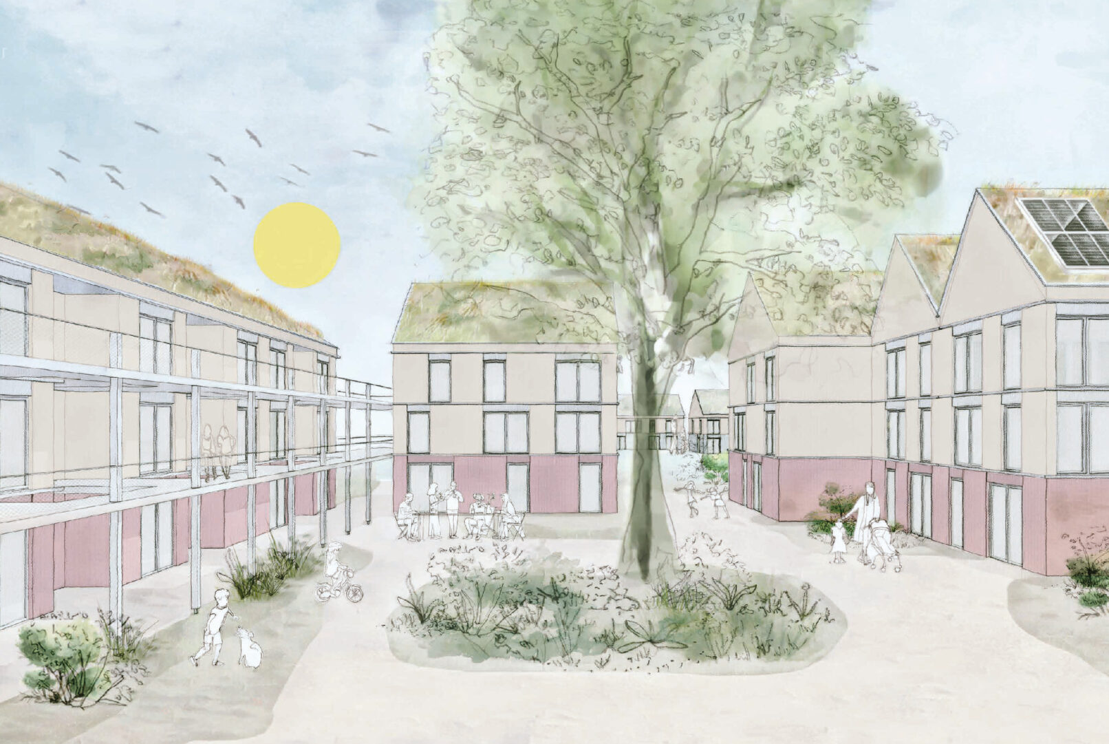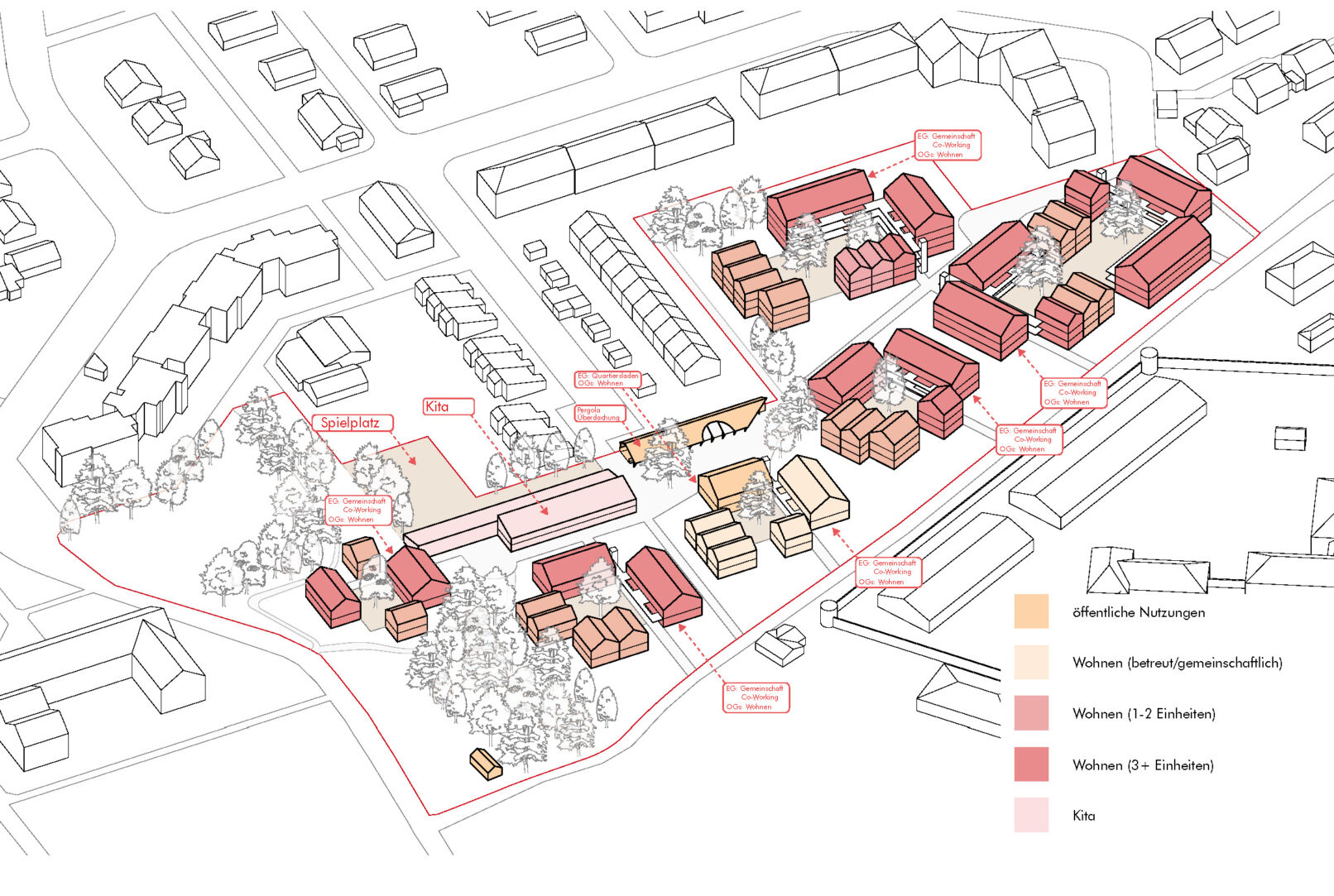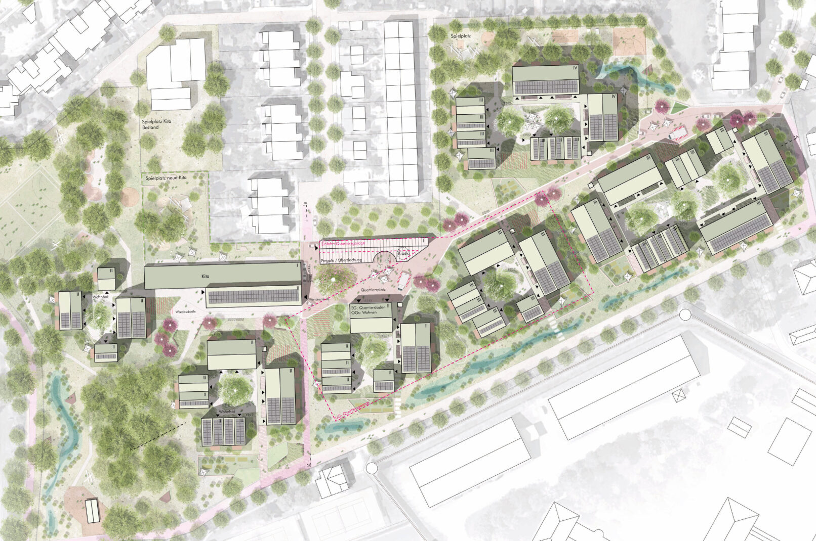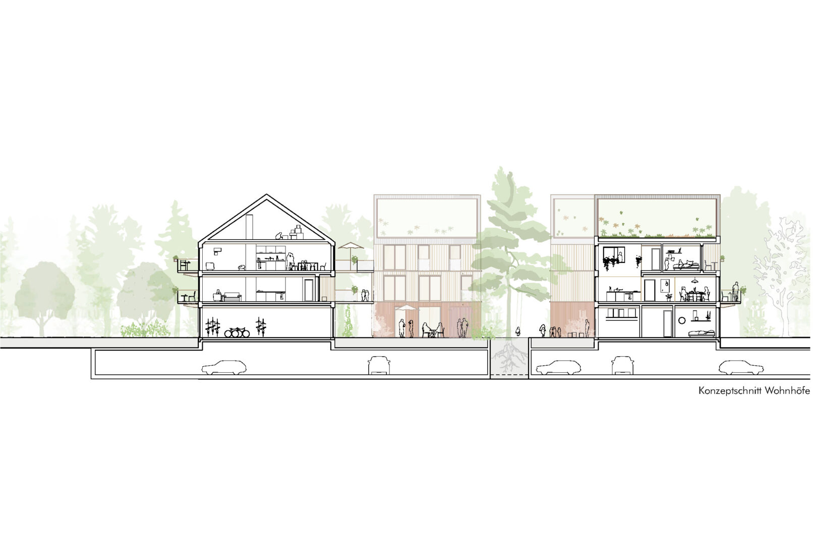 Der Entwurf von DGJ für das Grundstück in Landsberg entwickelt ein neues Wohnkonzept, das die Vorteile des Standorts, wie hoher Grünanteil und die Nähe zu Landschaft und Natur, mit innovativen Wohnideen verbindet, die bisher eher im städtischen Kontext zu finden waren: Gemeinschaftliches Wohnen von mehreren Generationen mit ergänzenden Angeboten, beispielsweise Gemeinschaftsräume und Co-Working-Spaces. In den ‚Wohnhöfen Pfettenstraße‘ können die Menschen Gemeinschafts- und Außenräume im Alltag teilen. Die Kinder spielen auf geschützten Grünflächen. Das Quartier selbst bietet nicht nur Naturnähe, reizvolle Außenräume und eine gute, nachbarschaftliche Vernetzung, sondern auch eine Infrastruktur mit idealen Voraussetzungen für einen modernen, nachhaltigen Lebens- und Arbeitsstil mit flexibler Tele-Arbeit, Kreativität und Unabhängigkeit. Durch den Kindergarten, den Quartiersladen und Spielplätze wird die Vereinbarkeit von Familie und Beruf erleichtert.