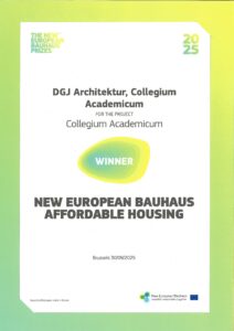 Das DGJ-Leuchtturmprojekt “Collegium Academicum” hat den NEW EUROPEAN BAUHAUS AWARD 2025 gewonnen. Es wurde damit unter insgesamt 683 Einreichungen aus allen 27 EU-Mitgliedsstaaten sowie dem Westbalkan und der Ukraine in der Kategorie “Affordable Housing” ausgewählt.